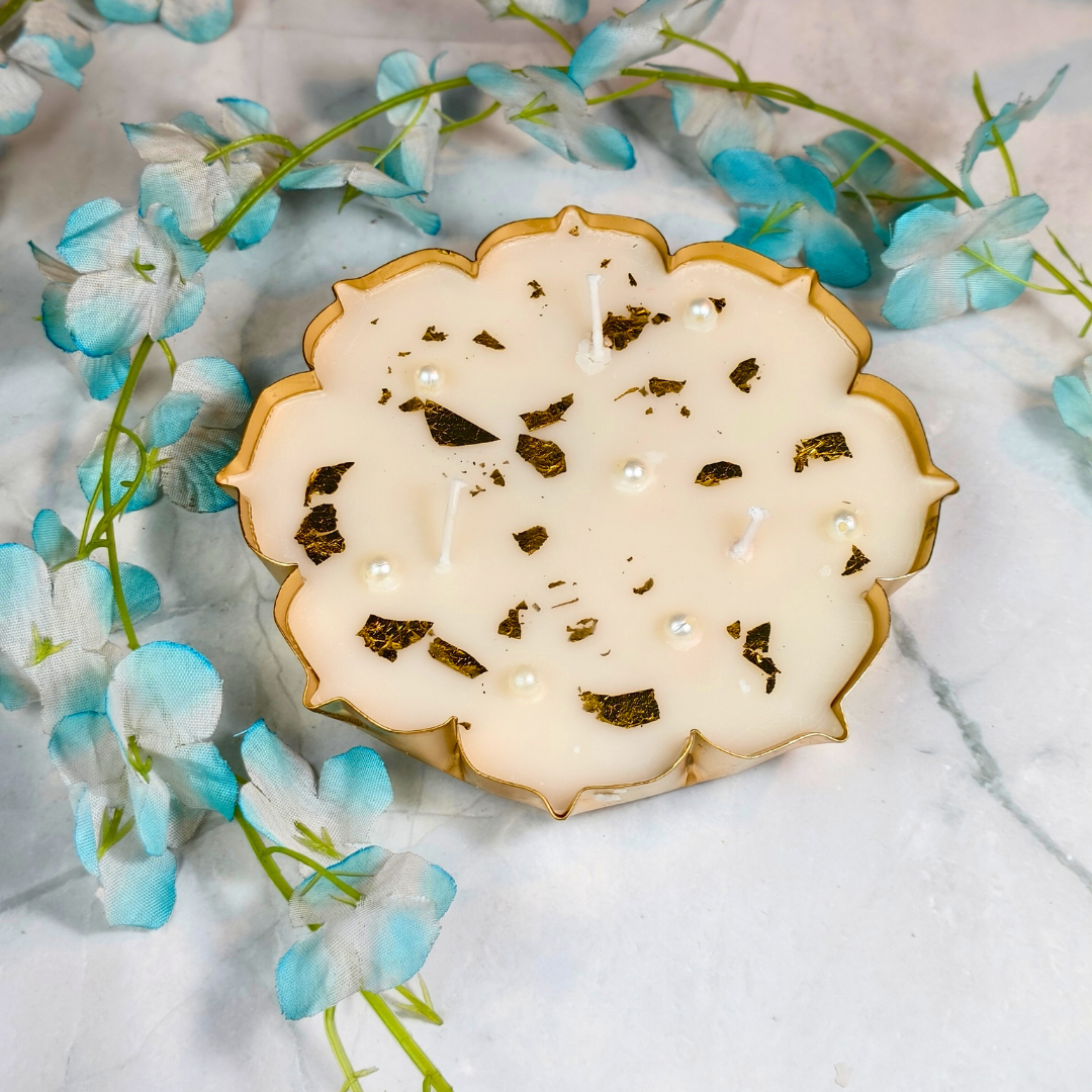 Awaken your celebrations with Beads of Dawn, a golden lotus urli candle adorned with delicate beadwork and gold foil. A luxury festive candle perfect for Diwali décor, weddings, or as a timeless gift of light and prosperity.