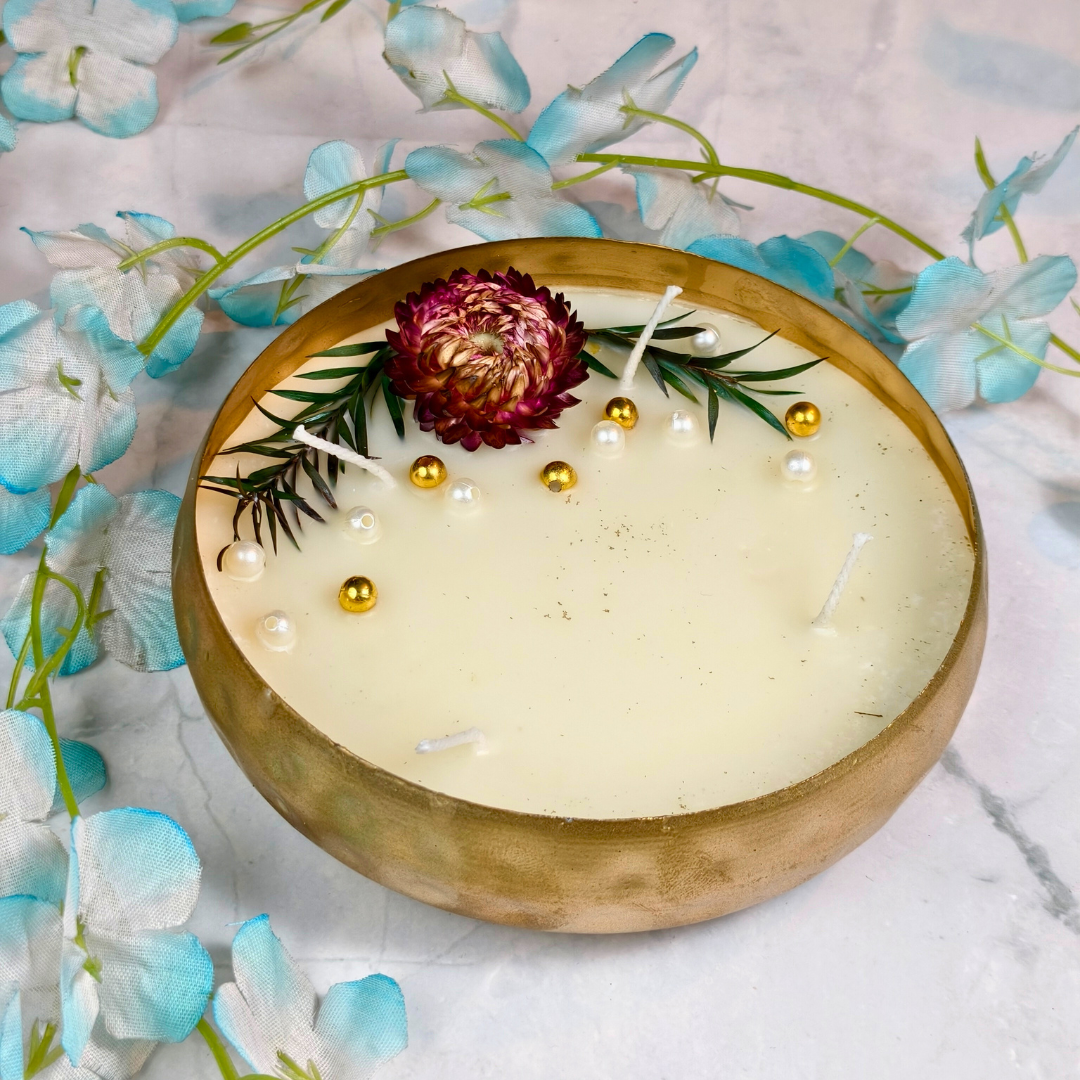 Illuminate your home with Circle of Light, a golden round urli candle crowned with floral blooms. Handcrafted for festive grandeur, this luxury candle is perfect for creating a warm, welcoming ambience during Diwali, pujas, or special occasions.