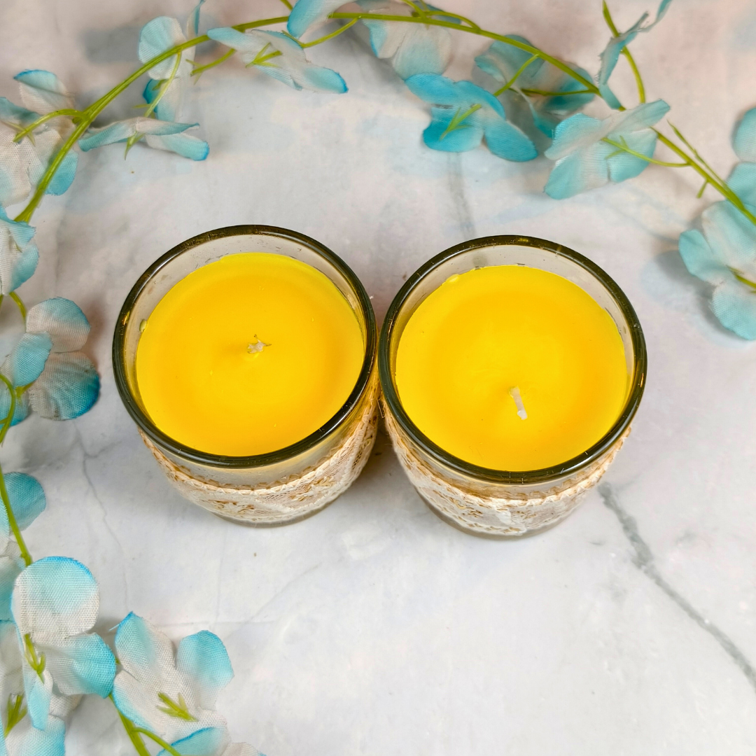 Celebrate togetherness with Samyukta, a set of 2 shot glass candles wrapped in elegant lace. A symbol of unity and love, these festive candles make thoughtful gifts and add sophistication to any celebration.